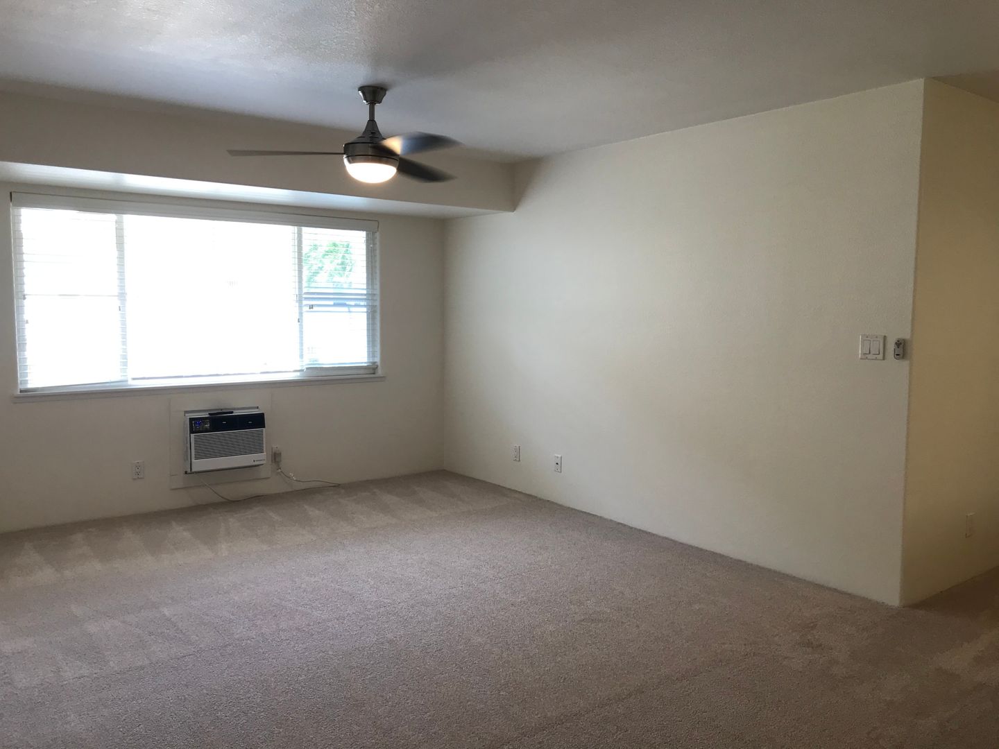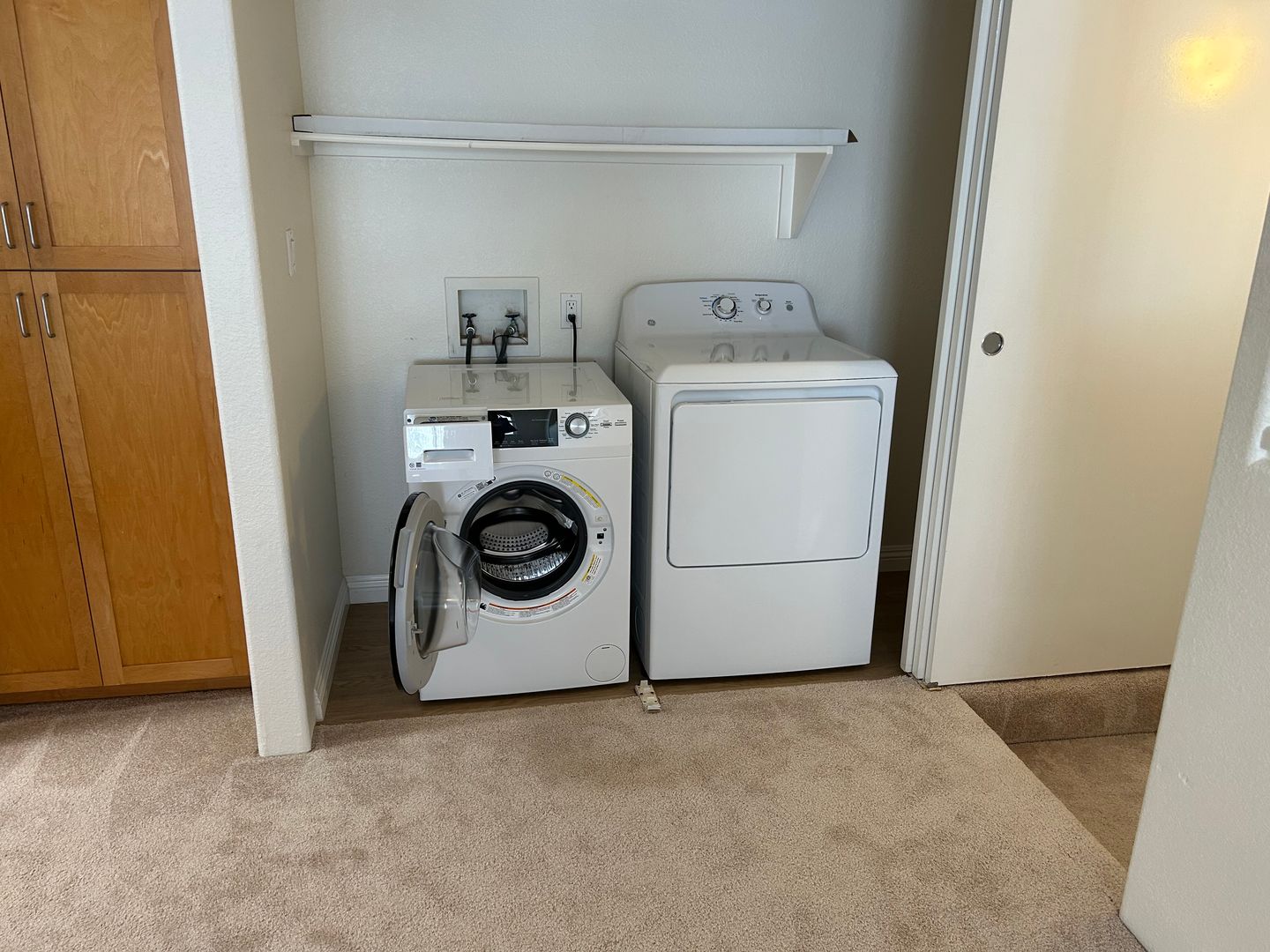 Full sized front load clothes washer and dryer in unit + there are 2 A/C units for cooling + ceiling fan.