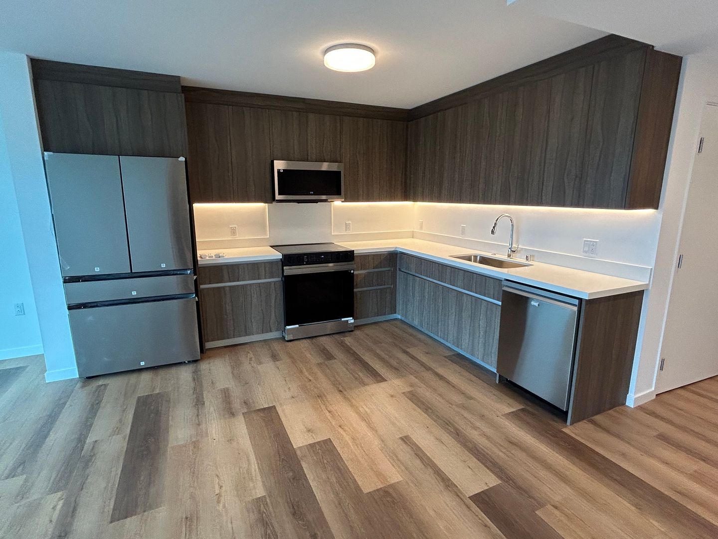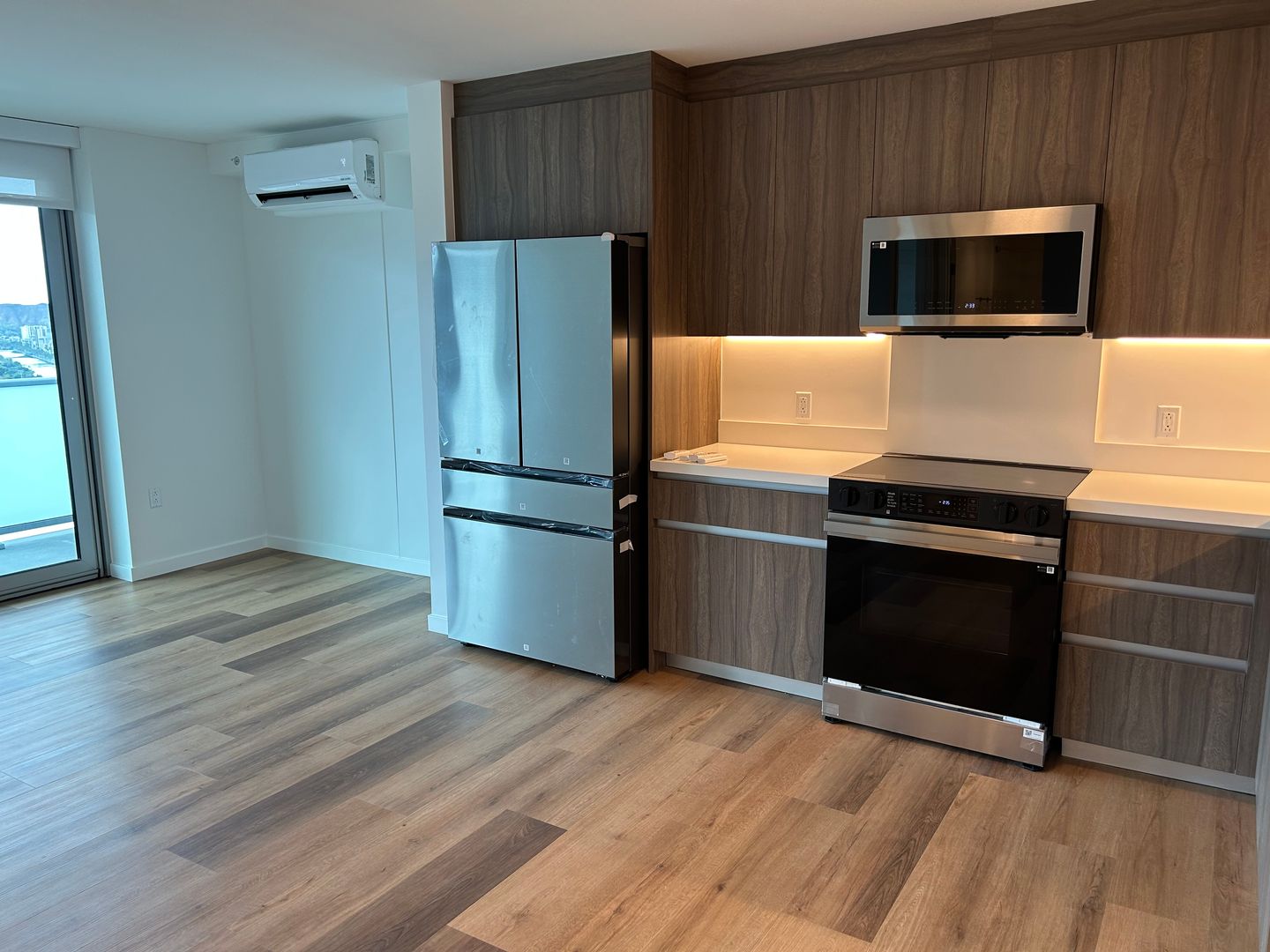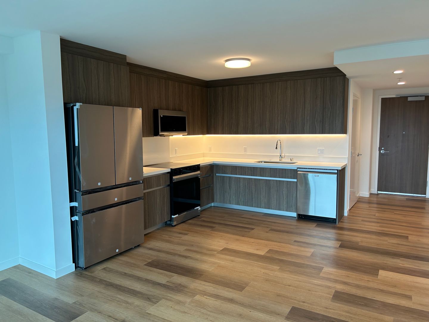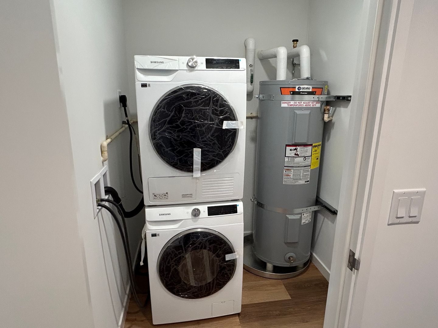 A full kitchen w/ upgraded stainless steel Samsung appliances! Samsung front load clothes washer and dryer located in the laundry-store room in the apartment.